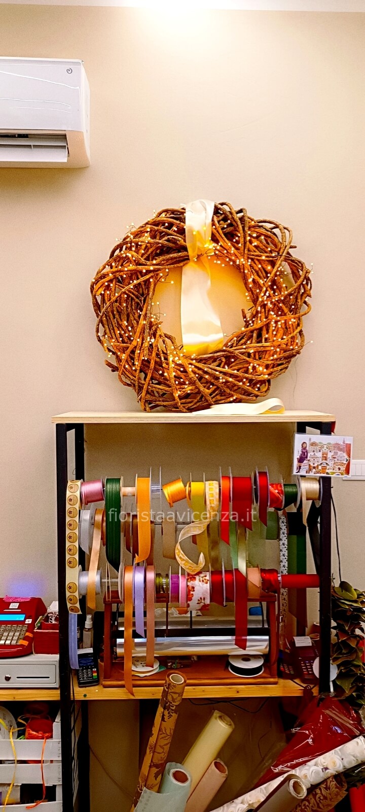 Ghirlanda in legno naturale con nastri preziosi e luci